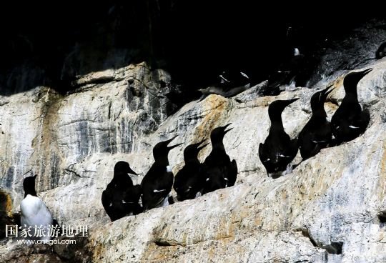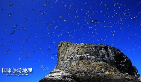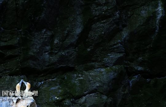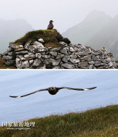 登上圣基爾達(dá)島并非易事,記者因風(fēng)高浪大在外赫布里底群島等待多日才有船出海。僅可乘載10余人的小船在風(fēng)浪中穿行了近3個(gè)小時(shí),圣基爾達(dá)島終于出現(xiàn)在霧色籠罩的海面上。島上散落著十余座已經(jīng)荒蕪破敗的石舍和幾百個(gè)儲(chǔ)物石室,這些殘存的遺跡早已成為野羊與海鳥(niǎo)的巢穴,人類(lèi)反而成為外來(lái)的訪(fǎng)客。人類(lèi)文明的消失為一些稀有的物種和瀕臨滅絕的鳥(niǎo)類(lèi)提供了安全的棲息地。島上陡峭的山坡隨處可見(jiàn)野羊悠然漫步,而那些嶙峋的峭壁和海礁則棲息著數(shù)十萬(wàn)只各類(lèi)海鳥(niǎo)。世界上最大的塘鵝群——約6萬(wàn)對(duì)塘鵝在這座海島及附近的海礁上繁衍生息。