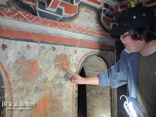 國家旅游地理 陜西延安9月15日訊 9月14日,考古學家正在查看畫像磚墓內的壁畫。經過近三個月的緊張工作,陜西省考古學家日前在陜西延安配合基建時,首次對一座宋金時期大型畫像磚墓進行了科學考古發(fā)掘。發(fā)現這座畫像磚墓竟是仿木磚結構多室墓,對了解和研究陜北畫像磚墓形制、建筑結構及其分布與內容等,具有重要的標尺性意義。 /新華社記者馮國攝
