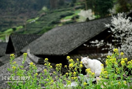 慶陽古街花香四溢,一只大白貓?jiān)跇琼敧?dú)享風(fēng)景(3月27日攝)。