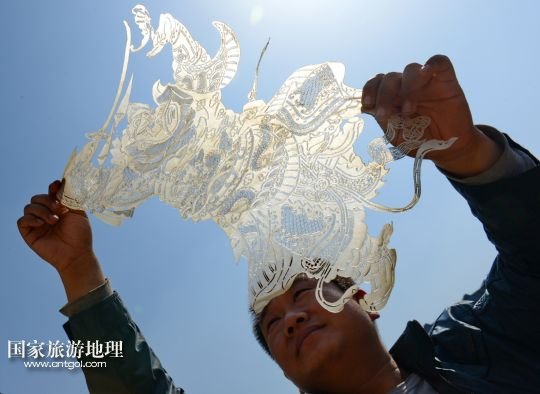 國家旅游地理 河北唐山4月2日訊 郭寶在檢查一件皮影藝術(shù)品的雕刻質(zhì)量(3月30日攝)。河北省遷安市趙店子鎮(zhèn)馬古寺村村民郭寶自幼喜歡皮影雕刻,師承當(dāng)?shù)氐窨趟嚾送跽淅舷壬?,他雕刻的影人造型古樸、工藝精?xì),深受皮影收藏愛好者的歡迎。2003年,郭寶成立了“郭寶皮影傳承工作室”,并從村里招來20多位喜歡皮影藝術(shù)的農(nóng)民專門從事皮影雕刻。經(jīng)過幾年的發(fā)展,如今郭寶皮影工作室開發(fā)設(shè)計皮影工藝品3000余種,在傳承保護(hù)唐山皮影的同時還獲得了豐厚的收入。 /新華社記者楊世堯攝