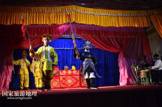 國家旅游地理 江西九江4月2日訊 在溪口鎮(zhèn)小溪村,三元班在演出寧河戲《三請(qǐng)樊梨花》(3月26日攝)。寧河戲是江西地方大型古老劇種之一,發(fā)源于江西修水縣,流行于贛北及湘、鄂、贛交界一帶。在寧河戲鼎盛的清乾隆年間,曾出現(xiàn)過“寧州十八班”,從業(yè)人員達(dá)到六七百人。然而隨著時(shí)代的變遷,寧河戲逐步?jīng)]落,最大的危機(jī)是逐漸空心化的村莊和村莊里越來越少的老戲迷。