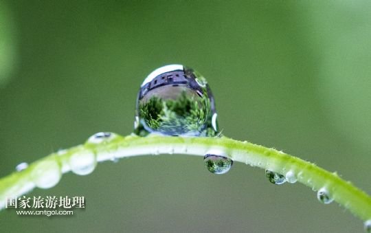 5月11日,土目源村的石屋倒映在水滴里(照片翻轉(zhuǎn)180度)。