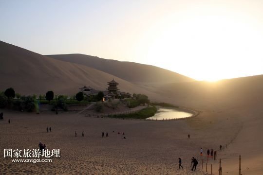 國家旅游地理 甘肅酒泉5月19日訊 夕陽下的甘肅省敦煌市鳴沙山月牙泉顯得更加迷人(5月18日攝)。初夏時節(jié),甘肅省敦煌市鳴沙山月牙泉景區(qū)風光秀美,吸引眾多中外游客前來觀光游覽。 新華社發(fā)(張曉亮 攝)