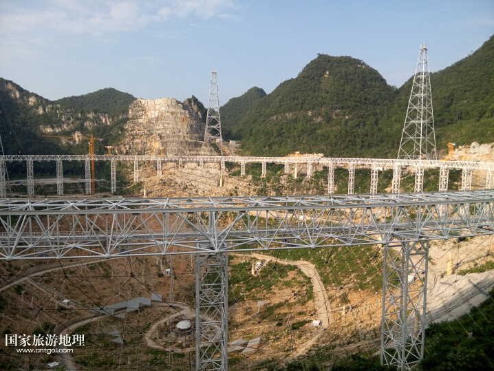 這是黔南平塘縣正在建設(shè)的大射電望遠(yuǎn)鏡,也稱 FAST,預(yù)計(jì)將于明年九月建成。FAST具有中國獨(dú)立自主知識產(chǎn)權(quán),是世界上正在建造及計(jì)劃中的口徑最大、最具威力的單天線射電望遠(yuǎn)鏡,其設(shè)計(jì)綜合體現(xiàn)了我國高技術(shù)創(chuàng)新能力。500米口徑球面射電望遠(yuǎn)鏡是利用貴州喀斯特地區(qū)的洼坑作為望遠(yuǎn)鏡臺址,建造世界第一大單口徑射電望遠(yuǎn)鏡,其擁有30個(gè)標(biāo)準(zhǔn)足球場大的接收面積。FAST作為世界最大的單口徑望遠(yuǎn)鏡,將在未來20至30年保持世界一流地位。