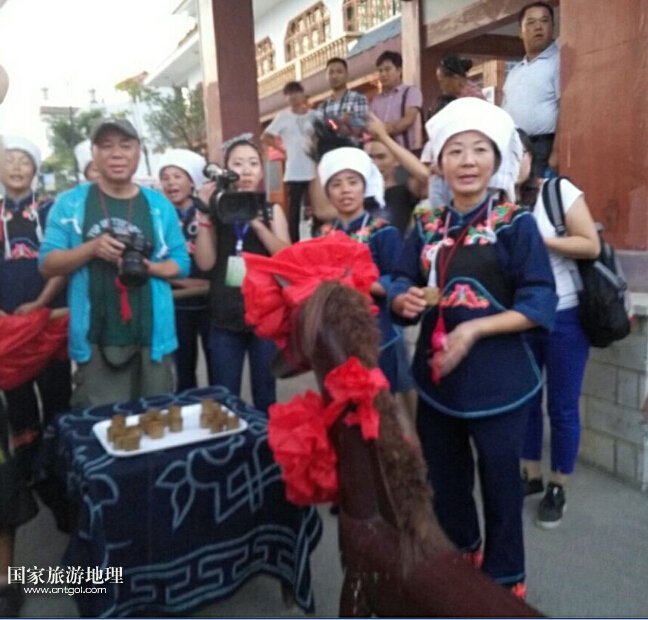 這是黔南惠水縣好花紅布依風(fēng)情寨,為了歡迎遠(yuǎn)方客人的到來,布依族人在寨門前擺滿酒杯唱起山歌。在進(jìn)寨前客人都要喝三杯攔門酒,喝完才能進(jìn)入寨中。同時(shí),布依族習(xí)俗中,遠(yuǎn)方客人到來,坐上木馬,喝完三杯米酒也寓意著會交好運(yùn)。