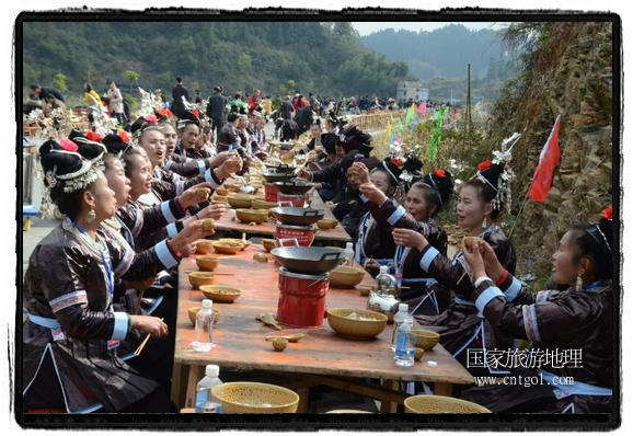 今年黎平侗年節(jié),除了延續(xù)亙古以來(lái)老百姓過(guò)侗年的各項(xiàng)傳統(tǒng)習(xí)俗活動(dòng)外,還有“天下侗家年”大型侗族史詩(shī)情景歌舞展演、侗族萬(wàn)人長(zhǎng)桌宴、招商引資推介會(huì)、七彩田園采摘體驗(yàn)、百村集市商品展銷、侗文化研討會(huì)、楊再思文化交流研討會(huì)等多項(xiàng)主題活動(dòng),其中,主打主推的“最大合攏宴”(萬(wàn)人長(zhǎng)桌宴)品牌,得到基尼斯紀(jì)錄總部到現(xiàn)場(chǎng)認(rèn)定,以1700桌合攏宴,總長(zhǎng)3.7公里,10380人同桌就餐,創(chuàng)歷史之最,成功載入《基尼斯紀(jì)錄大全》,吸引數(shù)萬(wàn)旅游客到場(chǎng)親自見證、參與、感受和體驗(yàn)這一千載難逢,氣勢(shì)恢宏的盛況。